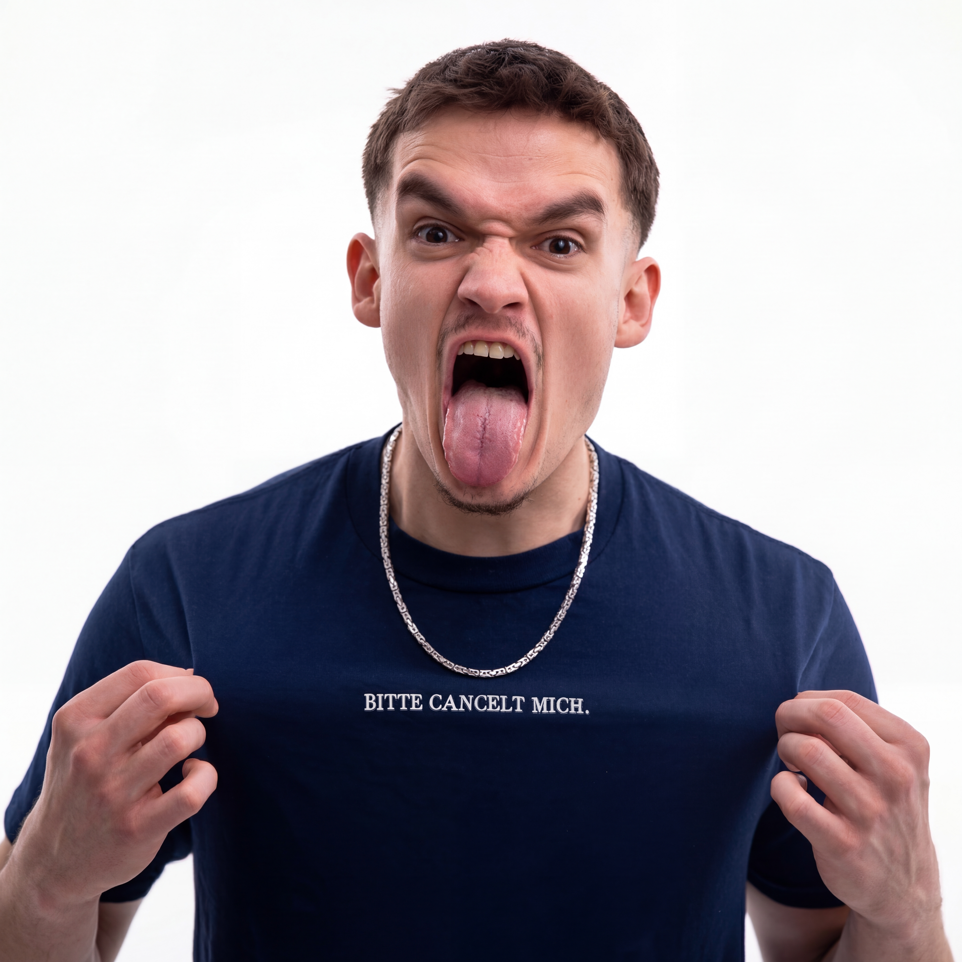 Mittig auf Brusthöhe befindet sich das eingestickte Logo „BITTE CANCELT MICH.“ in klarer, minimalistischer Optik. Kein unnötiger Schnickschnack – nur ein starkes Statement und ein sauberer Look.